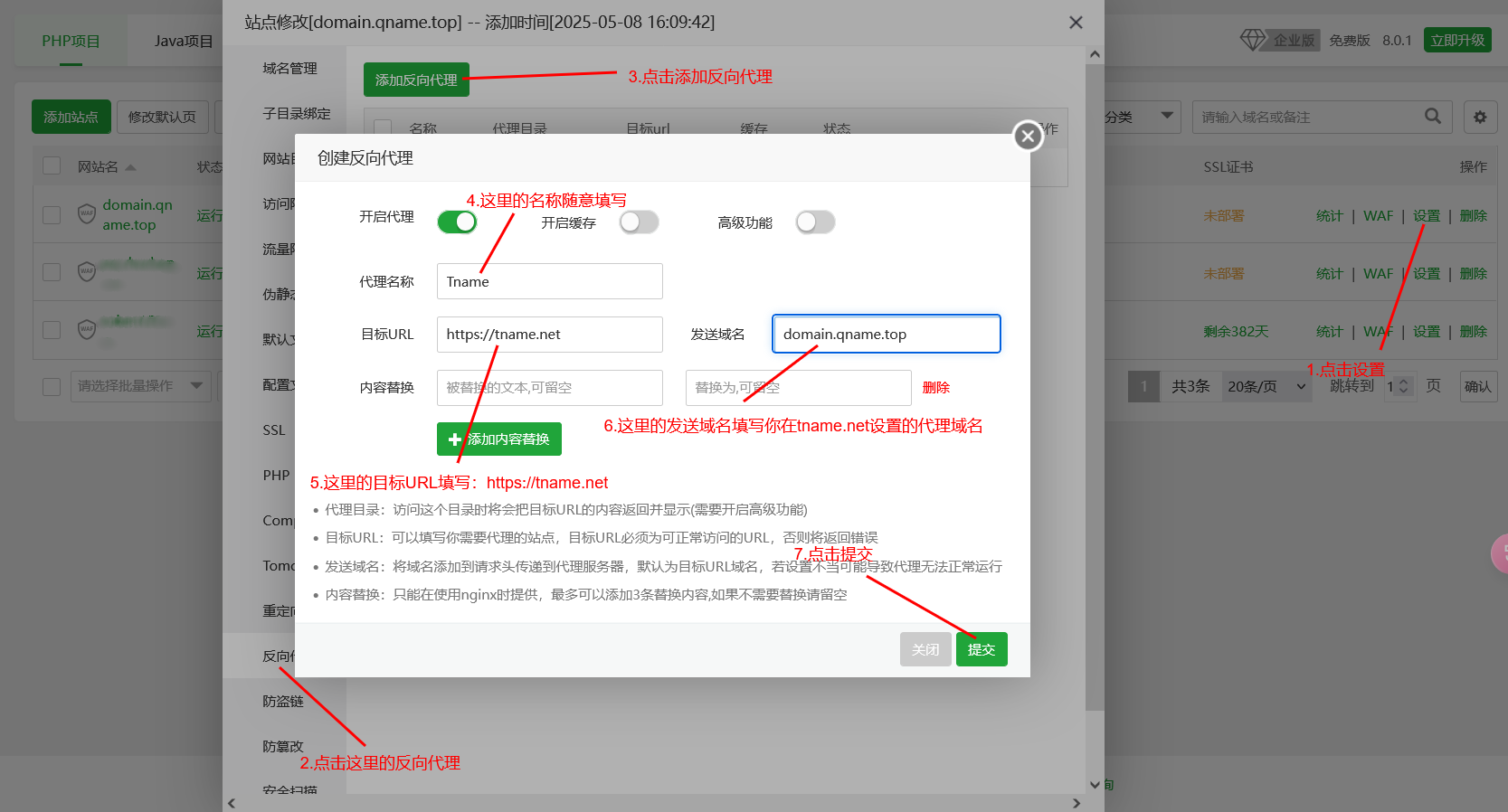 4、添加站点后点击设置->点击反向代理,如下图所示: